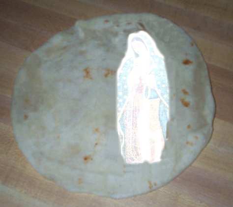 in the discolorations of a burnt tortilla one sees the face of Jesus.